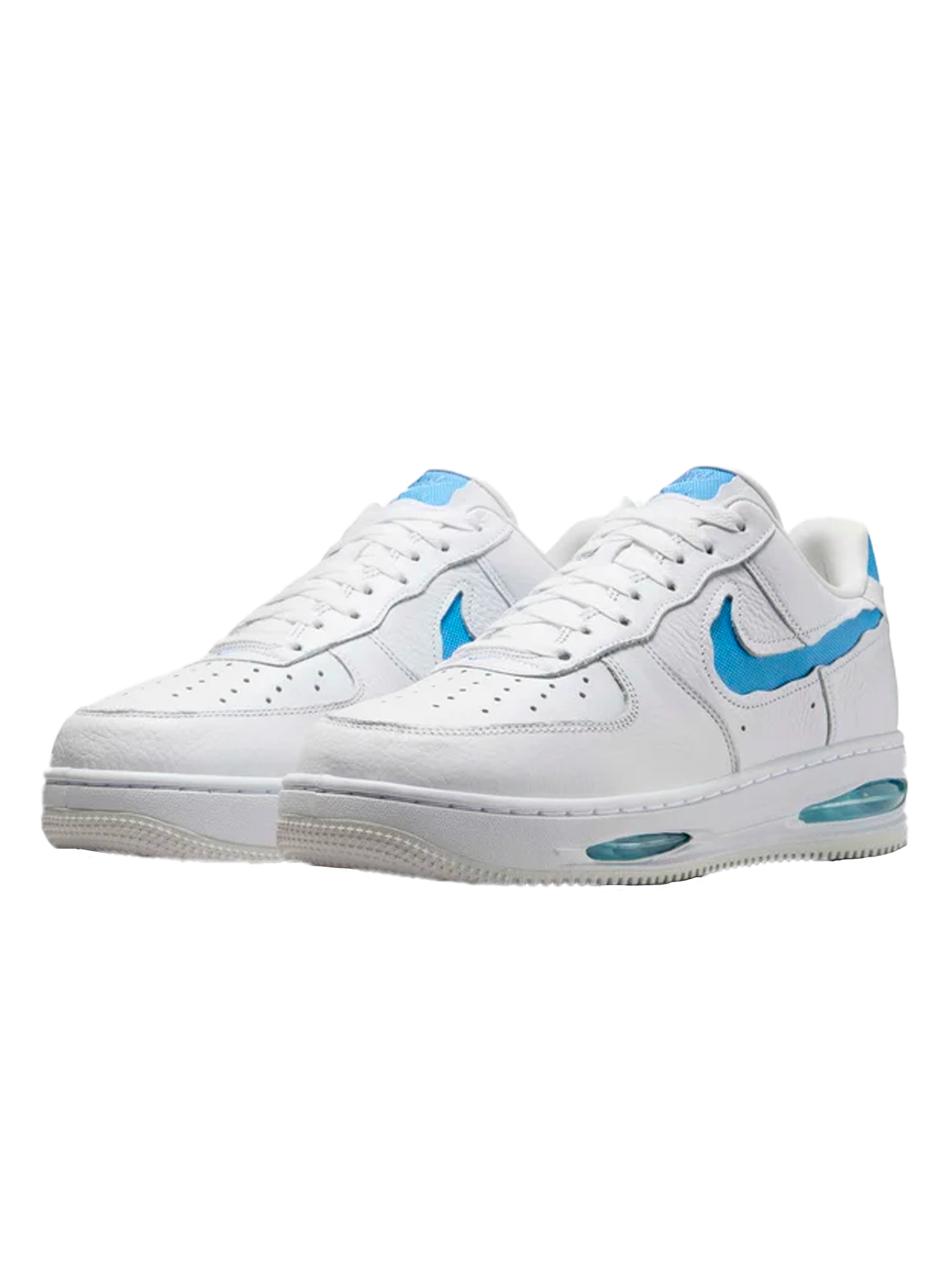 The model takes the classic Nike Air Force 1 Low silhouette and reinterprets it in the “Evo” version with cut-away details and a slightly updated design for a more modern look. The “White / Summit White / University Blue” colorway (white with university blue accents) offers a bright base and accents that recall Nike’s iconic University Blue.