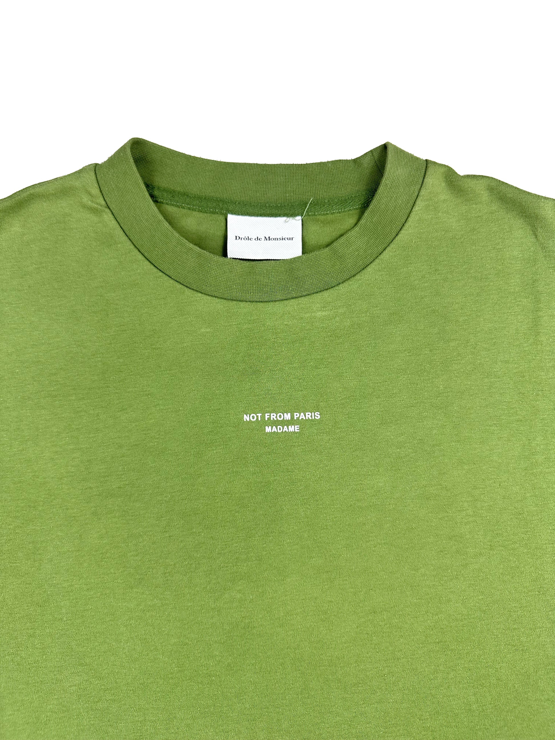 La T‑Shirt Slogan D‑TS191‑CO002‑KK di Drôle de Monsieur combina una presenza grafica distintiva con la qualità sartoriale contemporanea del brand francese. Realizzata in 100% cotone interlock (≈ 240 gsm), presenta un girocollo a costina, spalle lievemente cadenti e l’iconica stampa slogan “Not From Paris Madame” sul davanti e sul retro, in una tonalità kaki‑verde ricca di carattere. Il design unisex e il taglio regular la rendono adatta a look urbani minimal con una forte identità street‑chic.